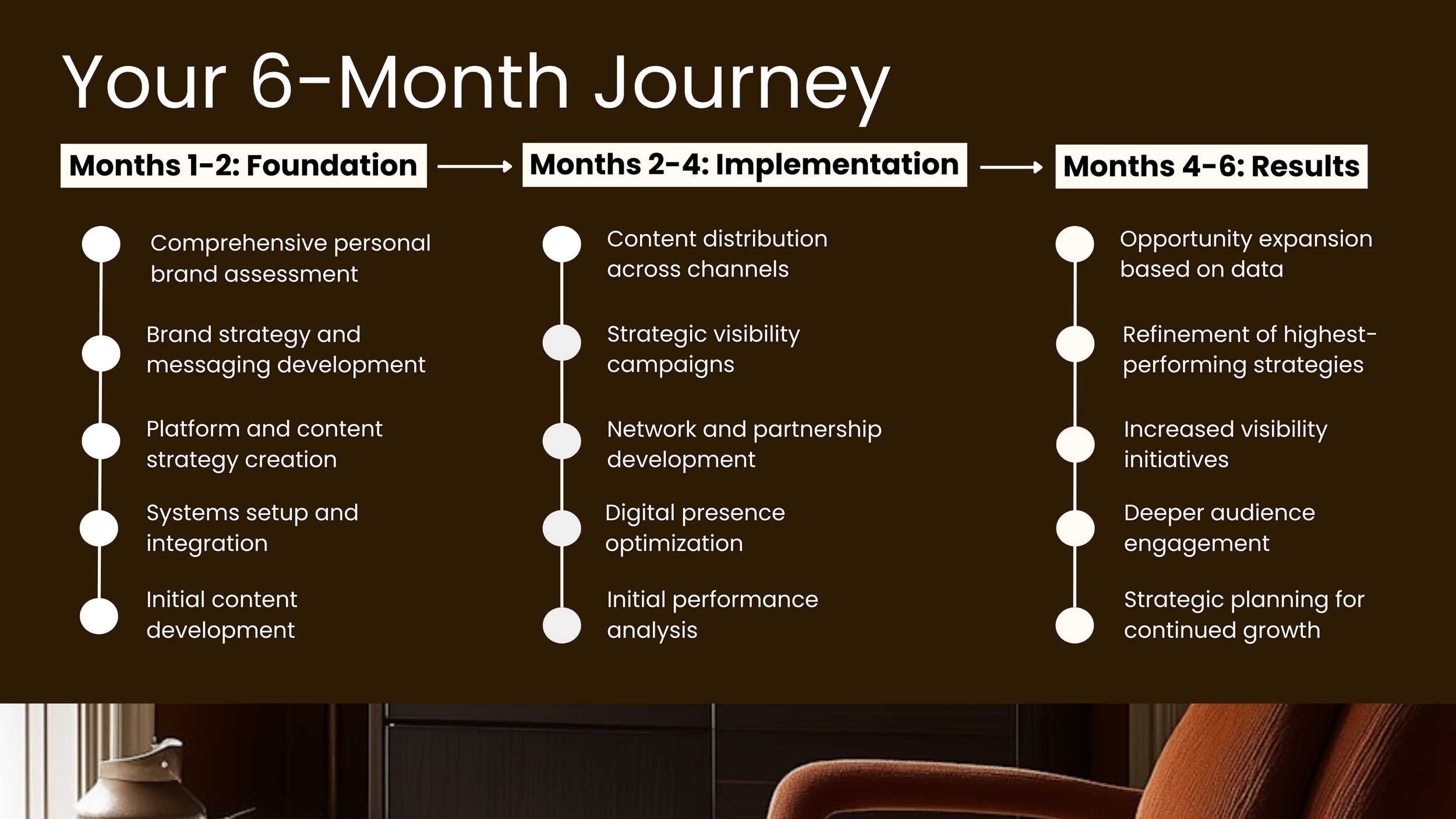 While specific results vary based on your industry, starting point, and objectives, our clients typically see significant improvements in their professional visibility, network quality, and opportunity flow within the first 3-4 months. By month 6, most clients have established sustainable visibility systems and clear pathways for continued growth. We'll establish specific metrics based on your goals during our initial strategy phase.